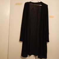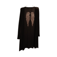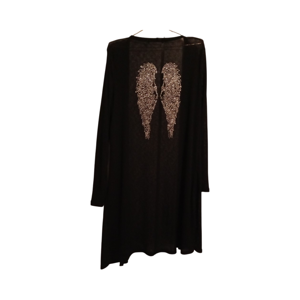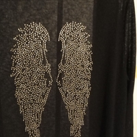 Pitkä musta läpikuultava ohut neule, koristeelliset strassisiivet selässä.
