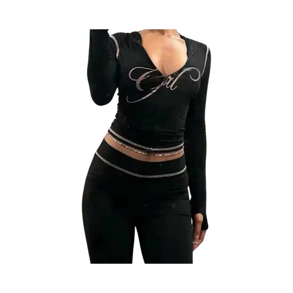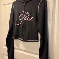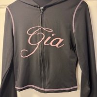 Lyhyt vetoketjullinen huppari, vaaleanpunaisin kirjauksin.