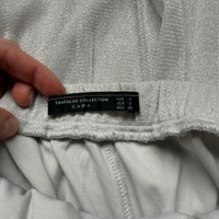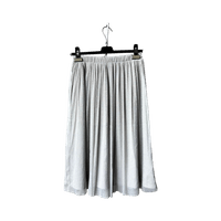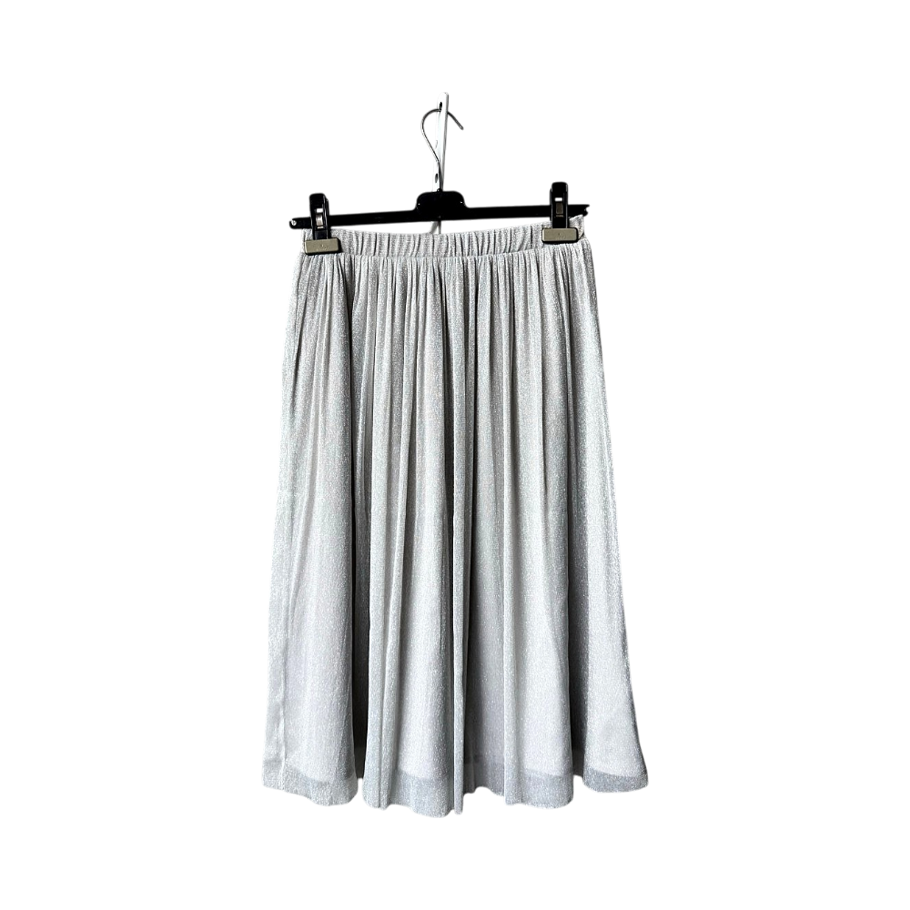 Zaran hopea polvi-/midipituinen hame. Koko s, vyötärönympärys 67 cm ja pituus 69 cm. Joustaa vyötäröltä. Henkarista jäänyt toiselle puolelle kellertävät jäljet (viimeinen kuva).