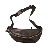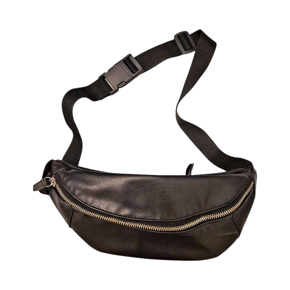 Musta vyölaukku, jossa kullanvärinen vetoketju ja säädettävä hihna.