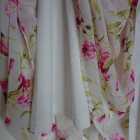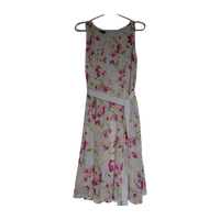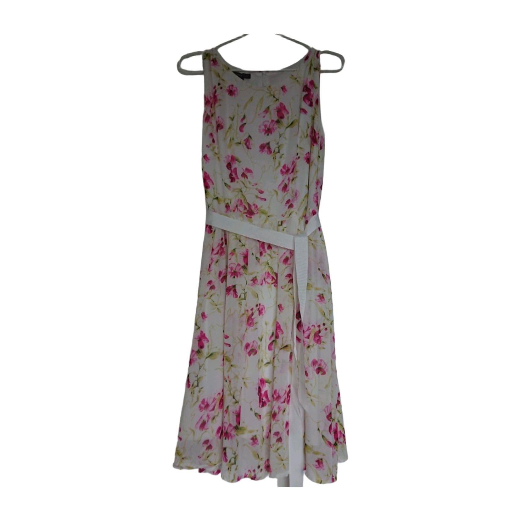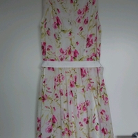 Juhlamekko, jossa vetuketju selässä ja kangas kaksinkertainen (alla valkoinen, päällä ohut kukkakuvioinen). Ei näy läpi, vyön voi laittaa rusetille ja halutessa voi vaihtaa/ottaa pois. Huomaamattomat taskut löytyy molemmilta puolilta. Helmassa paljon kangasta eli on ihanan liehuva ja laskeutuu nätisti. Käytetty joitakin kertoja, mutta moitteettomassa kunnossa. Kangas ei rypisty, vaikka säilyttäisi mytyssä.