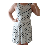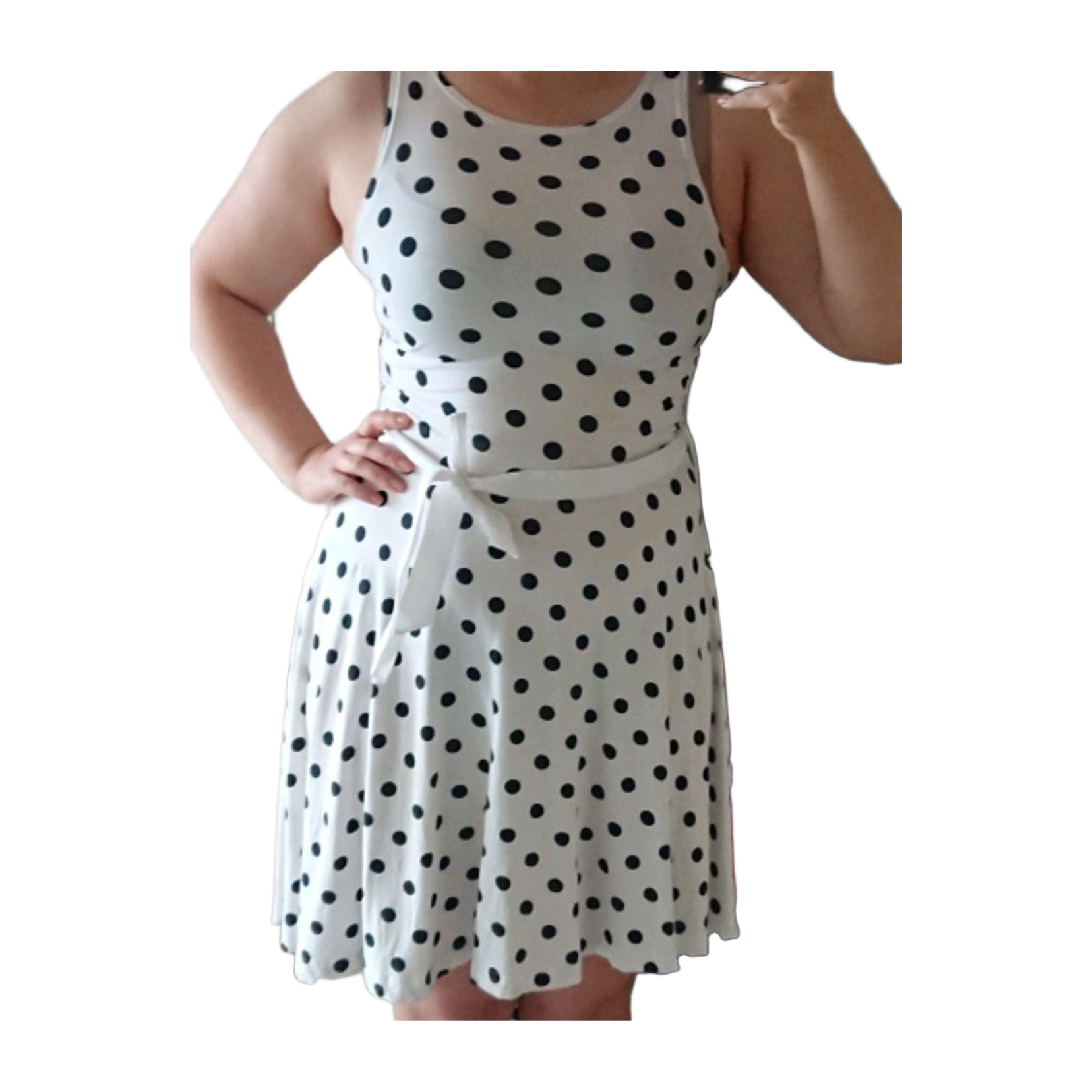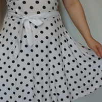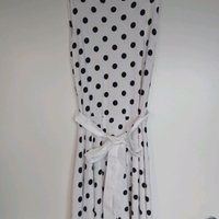 Klassisella pallokuviolla ja ihan super joustavaa ja nätisti laskeutuvaa kangasta oleva mekko. Vyö on irtoinainen ja siis myös vaihdettavissa. Kokolapussa on S, mutta kuvista näkee istuvuuden L kokoisellakin eli riippuen haluaako löysempää vai ihonmyötäistä istuvuutta menee S-L. Käytetty vain muutamia kertoja. Saattaa vähän näkyä läpi, mutta puuterinväriset alusvaatteet ei ainakaan.