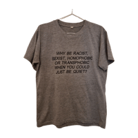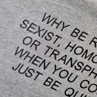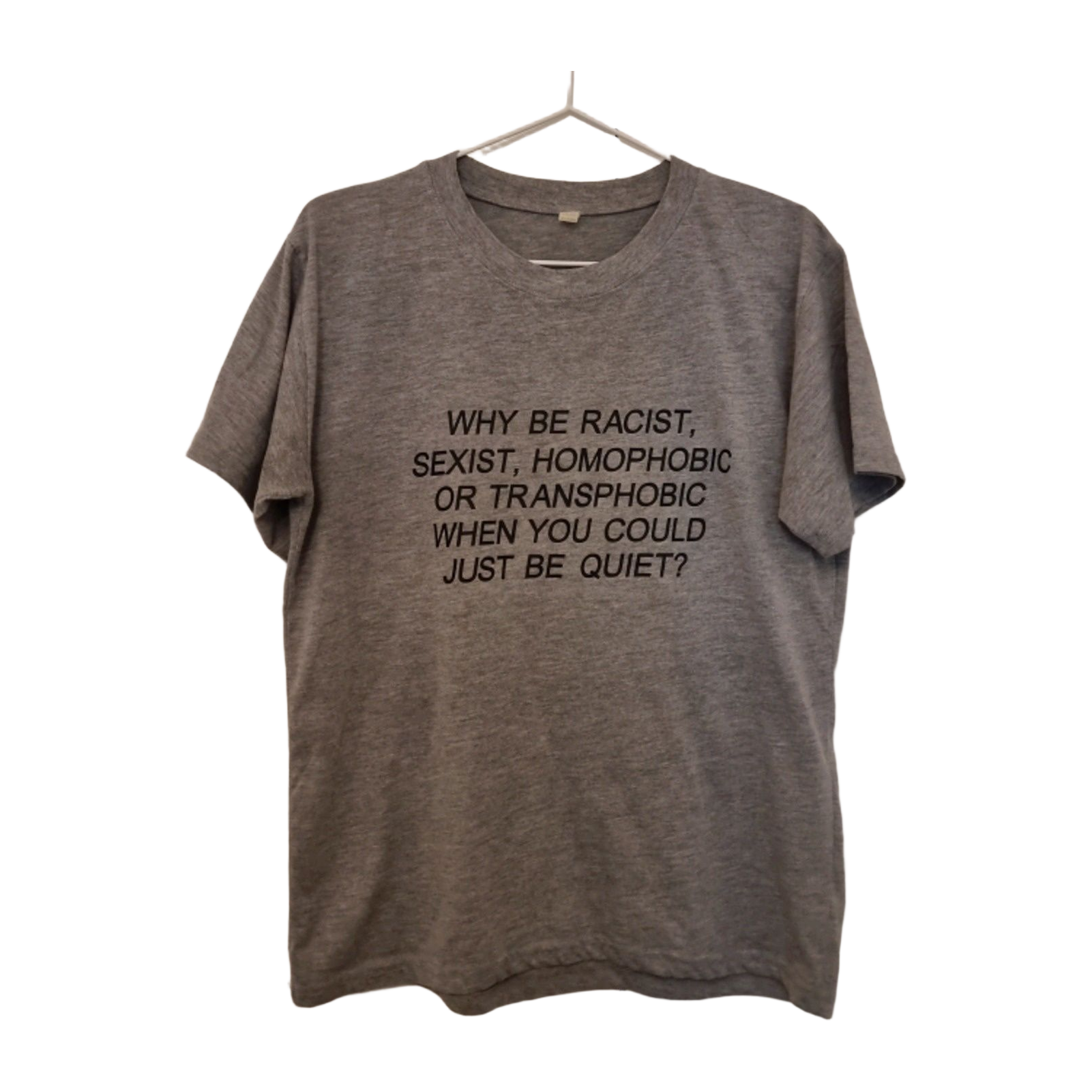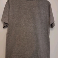 Harmaa t-paita, jossa teksti. Ollut käytössä, mutta edelleen moitteeton kunto, kirjaimet eivät ole lähteneet kulumaan.