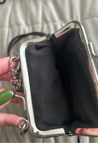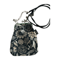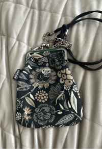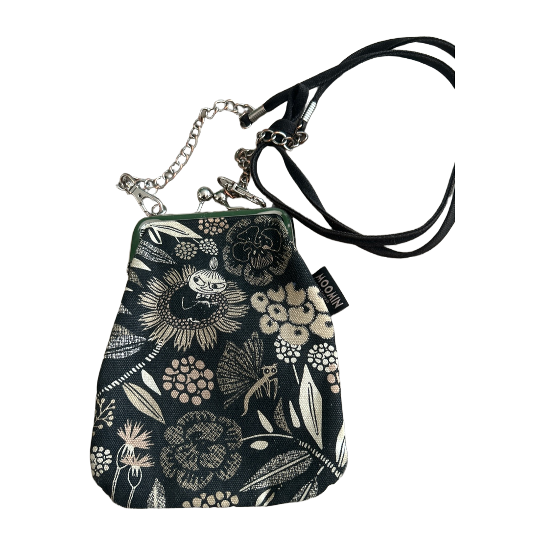 Pieni musta kukkakuvioinen laukku ketjuhihnalla