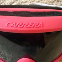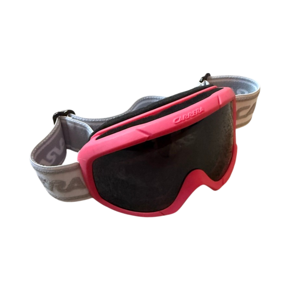 Tyylikkäät Carrera-laskettelu/lumilautailulasit lapselle, vaaleanpunaisella kehyksellä ja leveällä valkoisella logonauhalla. Linssi tumma, sopii hyvin kirkkaisiin olosuhteisiin ja suojaa tehokkaasti auringonvalolta ja lumihangesta heijastuvalta säteilyltä. Mukavat ja kevyet päässä, pehmeä sisäpehmuste.