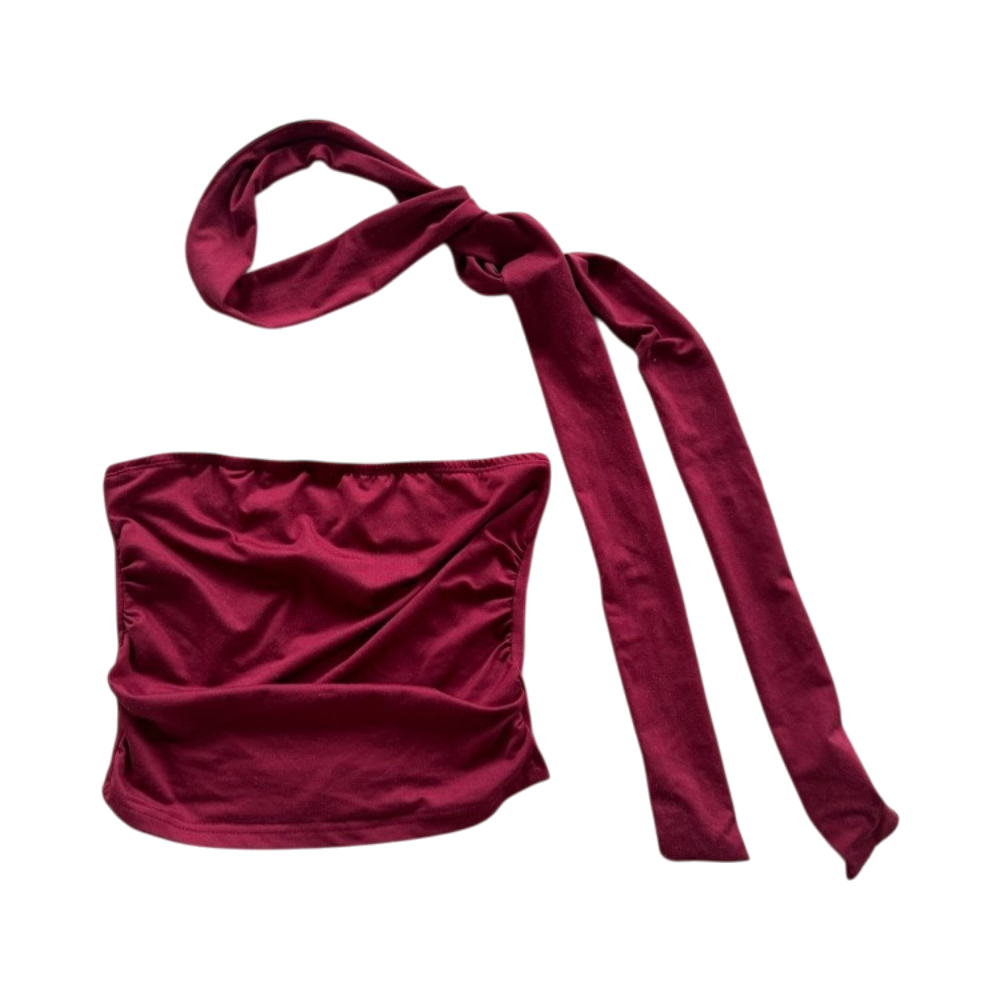 Lyhyt burgundyn tubetoppi, solmittava kaulanauha, joustavaa materiaalia.