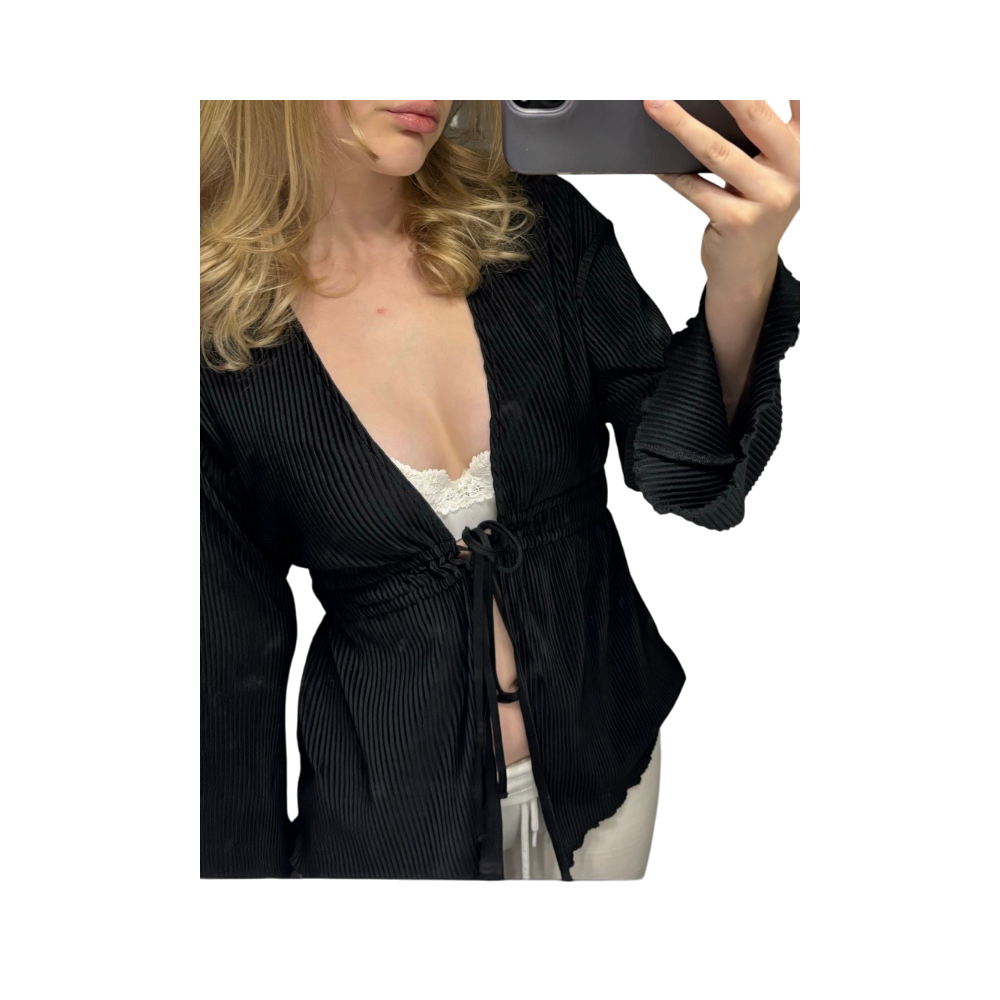 edestä sidottava gina tricotin musta pusero. koko xs, mutta menee myös ainakin s kokoiselle. Käytetty vain kerran tai kaksi :)