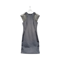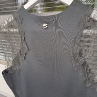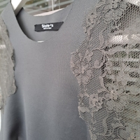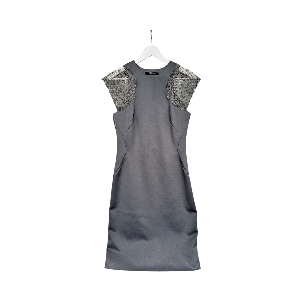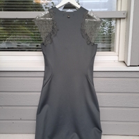 Tyylikäs harmaa mekko, jossa pitsiset hihat.