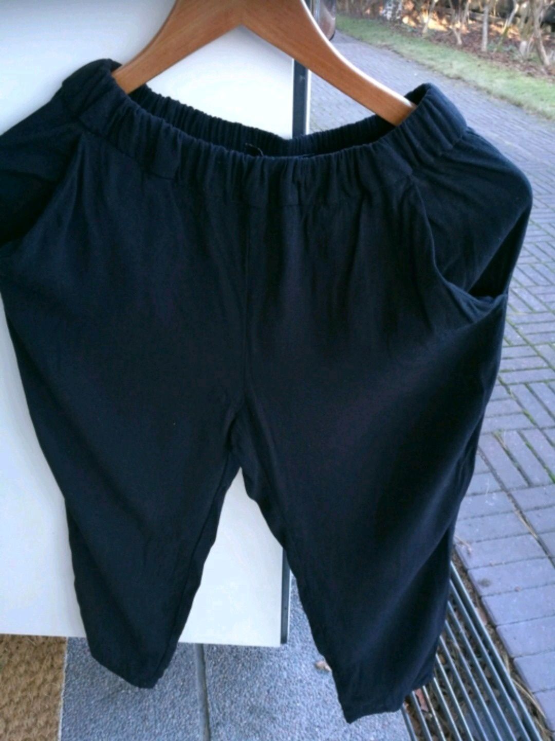 Tästä ihanat kesähousut! Itselläni on näitä kahdet, mikä on kuitenkin liioittelua joten luovun toisista. Vilpoisat ja väljät. Kuvissa pesun jäljiltä hiukan ryppyiset, mutta ovat hyvässä kunnossa. Koko s. Nettikaupassa näitä oli nyt vain villaisina saatavilla.
