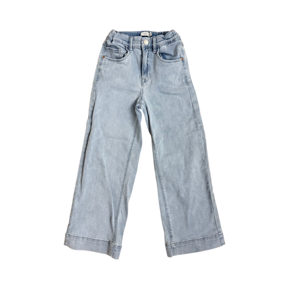 Vaaleat leveälahkeiset farkut, taskut takana. Hyväkuntoiset