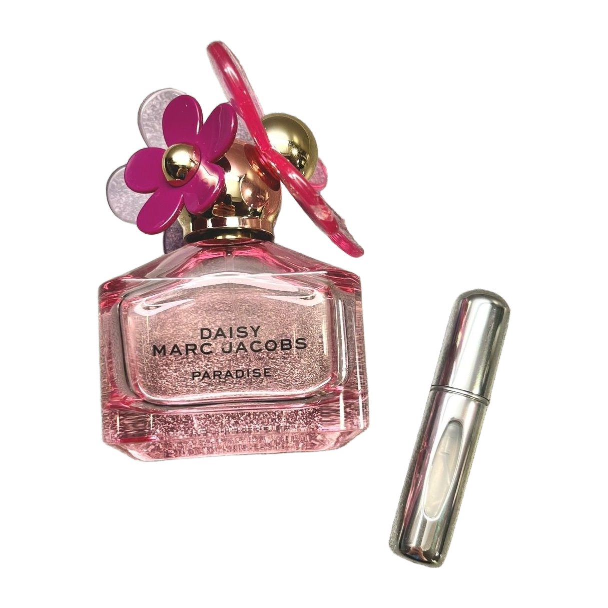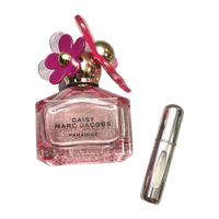Naisten Marc Jacobs Daisy Paradise Eau de Toilette -tuoksu. Vuoden 2023 rajoitettu erä. Ovh 83e/50ml. Ilmoituksessa mainittu hinta sisältää 5ml tuoksua ja kuvassa näkyvän pienen uudelleen käytettävän hajuvesipullon. Hajusteen litrahinta sama, kuin 50ml pullossa.