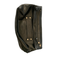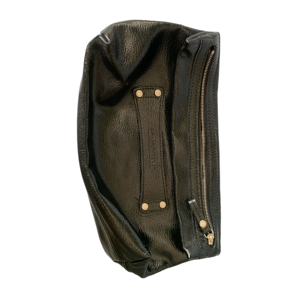 Black patent leather clutch bag with butterfly print lining by Longchamp, zipper closure.