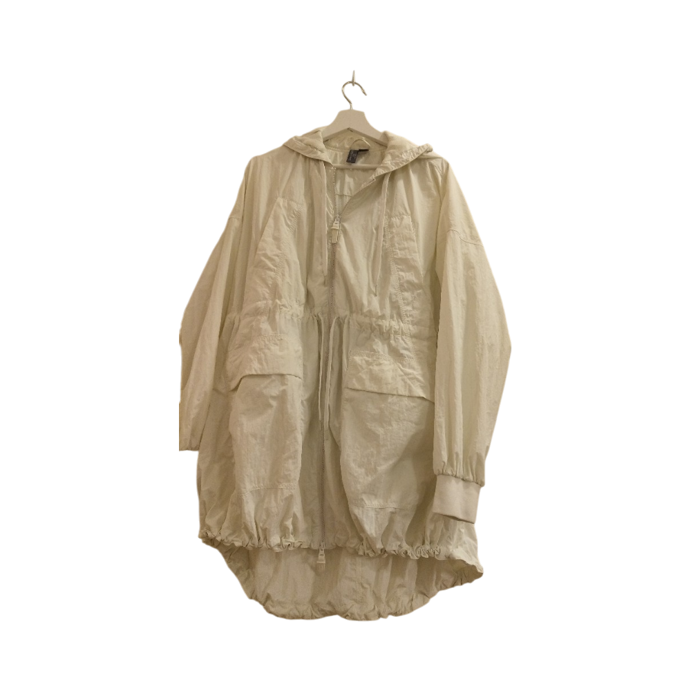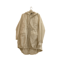 Kevyt valkoinen hupullinen parkatakki, säädettävä vyötärö, helmassa kuminauharypytys. Helma takaa hieman pidempi. Takin koko S. Takki mitoitukseltaan todella väljä. Takissa edessä neljä taskua ja vetoketju. Takki 100% polyamidia. Takin hupussa musta tahra, joka ei ole lähtenyt pesussa pois. Luultavasti pyörän ketjuista tullut. Katso kuvat. Muuten hyväkuntoinen, siisti ja ehjä. Melko vähälle käytölle jäänyt. Itselle hieman turhan suuri. Koiratalous. Voidaan sopia myös noudosta akselilla Kerava-Korso.