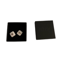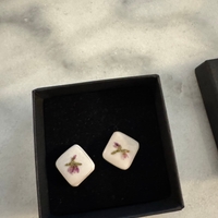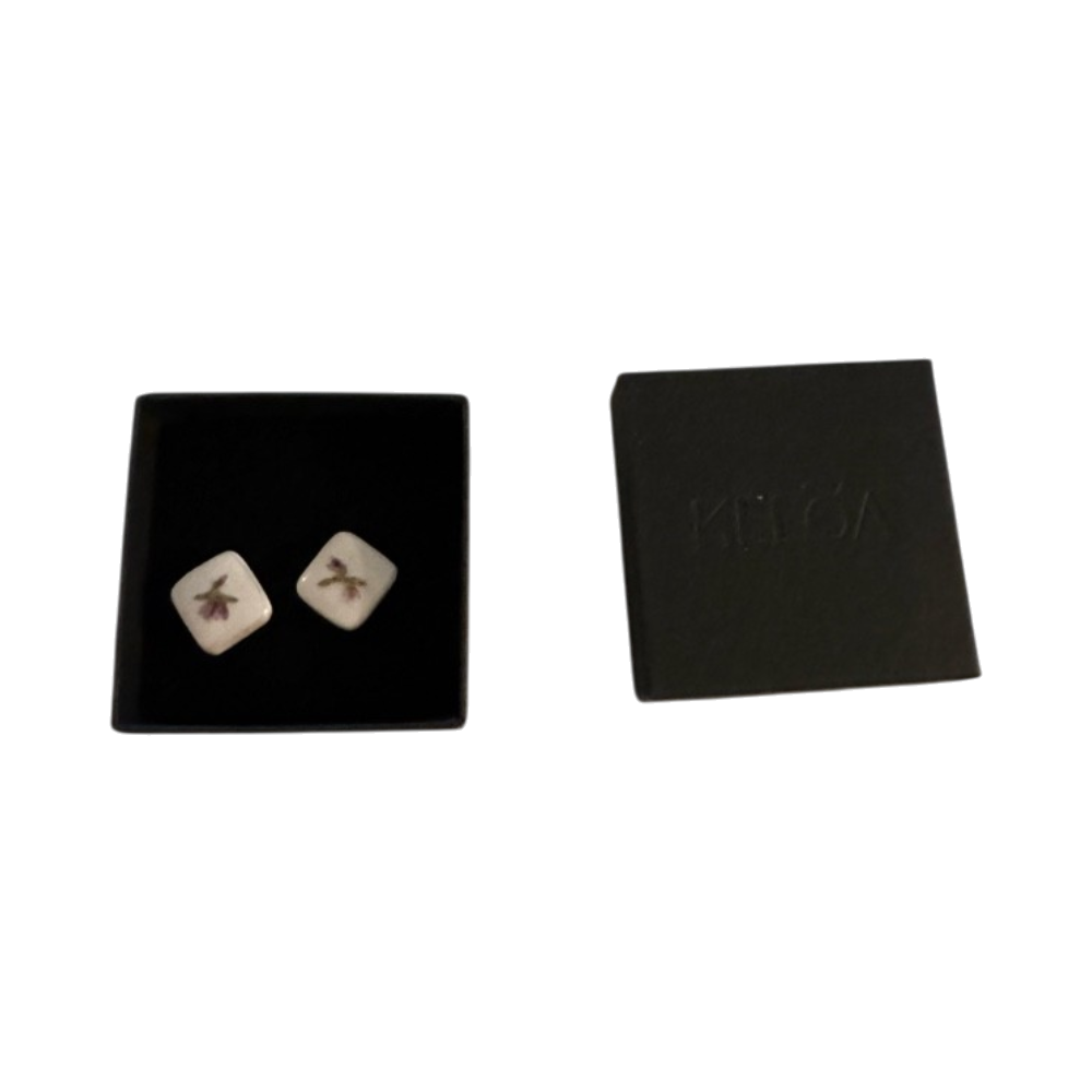 Neliönmuotoiset posliini-korvakorut, pieni kukkakuosi.