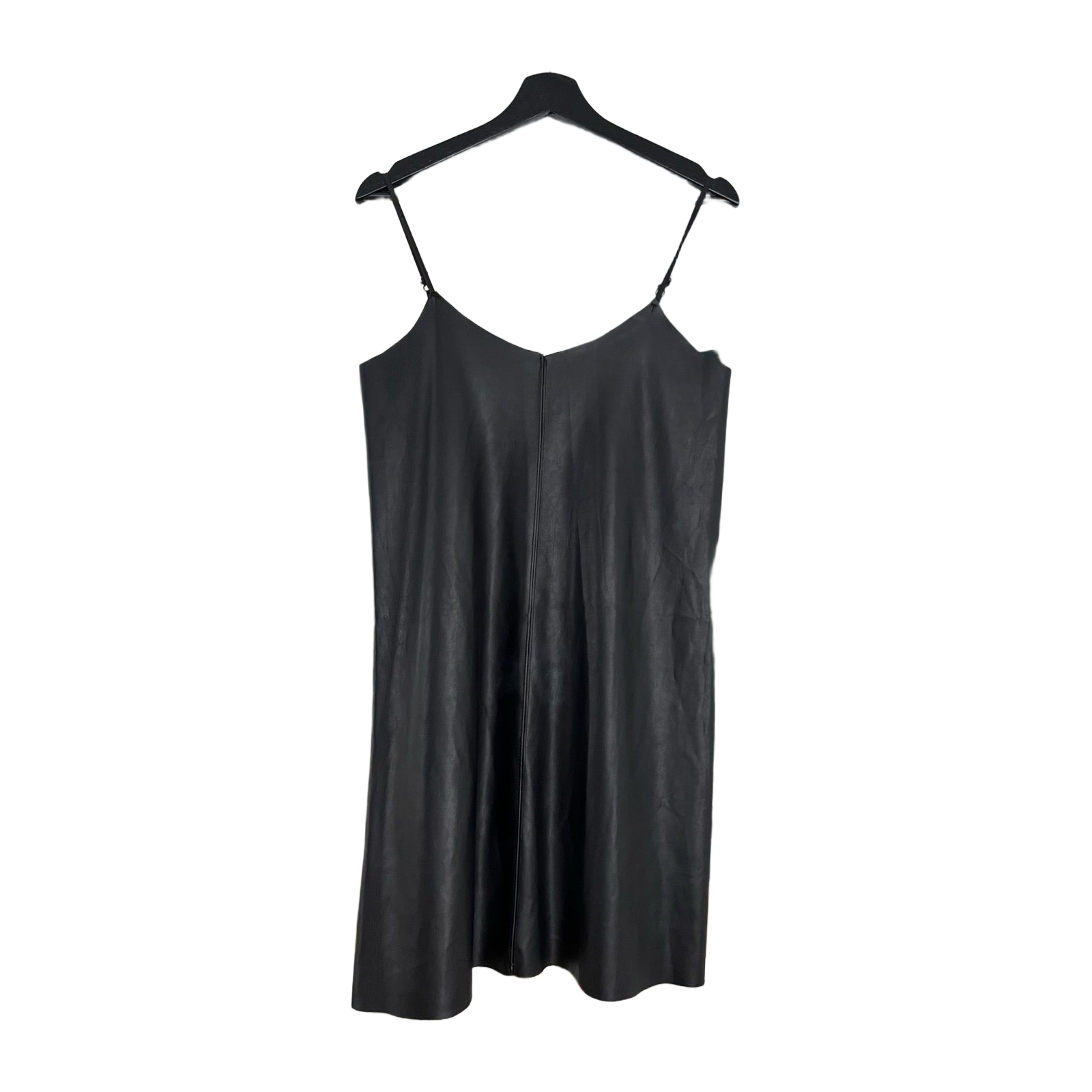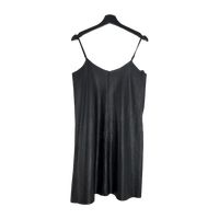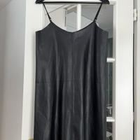 A cute black dress made from a leather-like material. Measures ca. 88cm from the straps all the way down