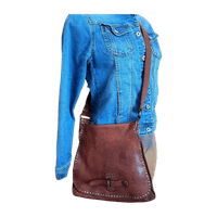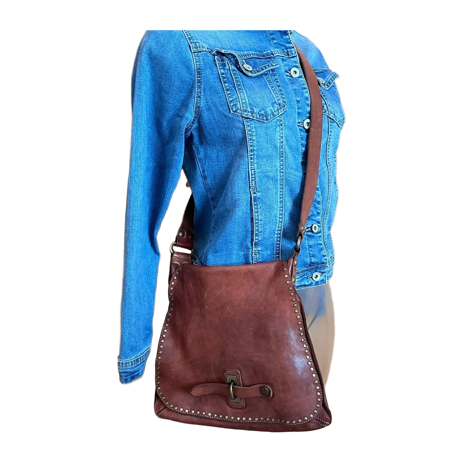 Campomaggin crossbody/messenger-laukku. Laadukasta, hieman kulutetun näköistä nahkaa. Säädettävä olkahihna, johon on tehty pari reikää lisää. Leveys alhaalta n. 30 cm (kapenee hieman ylöspäin), korkeus n. 29 cm.
