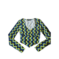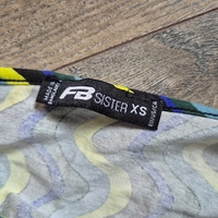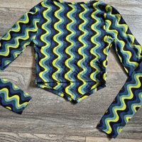 Värikäs aaltoileva kuvio, V-pääntie, croptop, koko XS, vastaa kokoaan, ei juuri jousta. Käytetty ehkä kerran. FBSisters