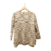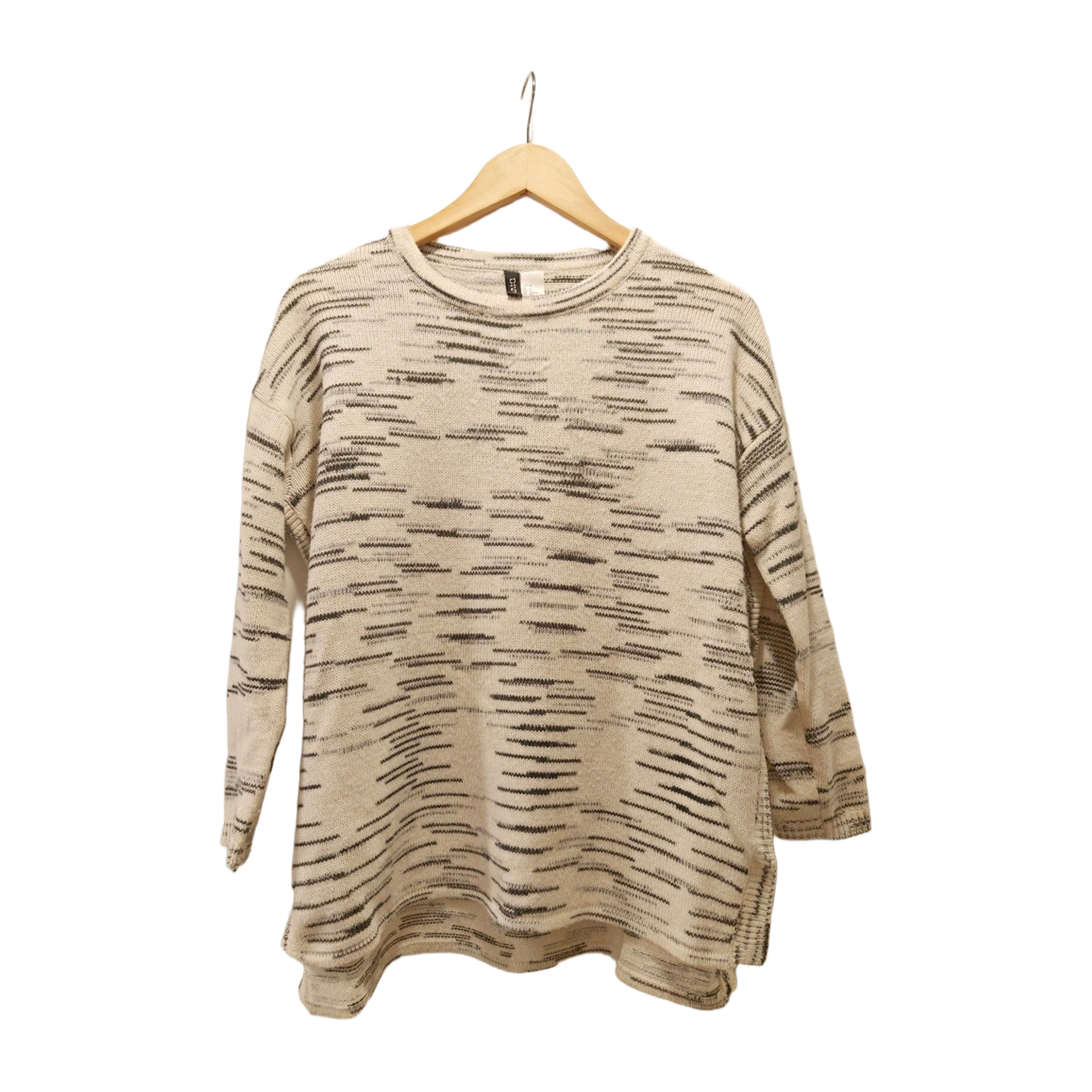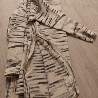 Luonnonvalkoinen neule jossa mustia ja harmaita viivakuvioita. Vekit kyljissä yltäen paidanhelmasta hieman yli puolivälin. Hihat ei täyspitkät.