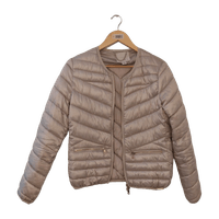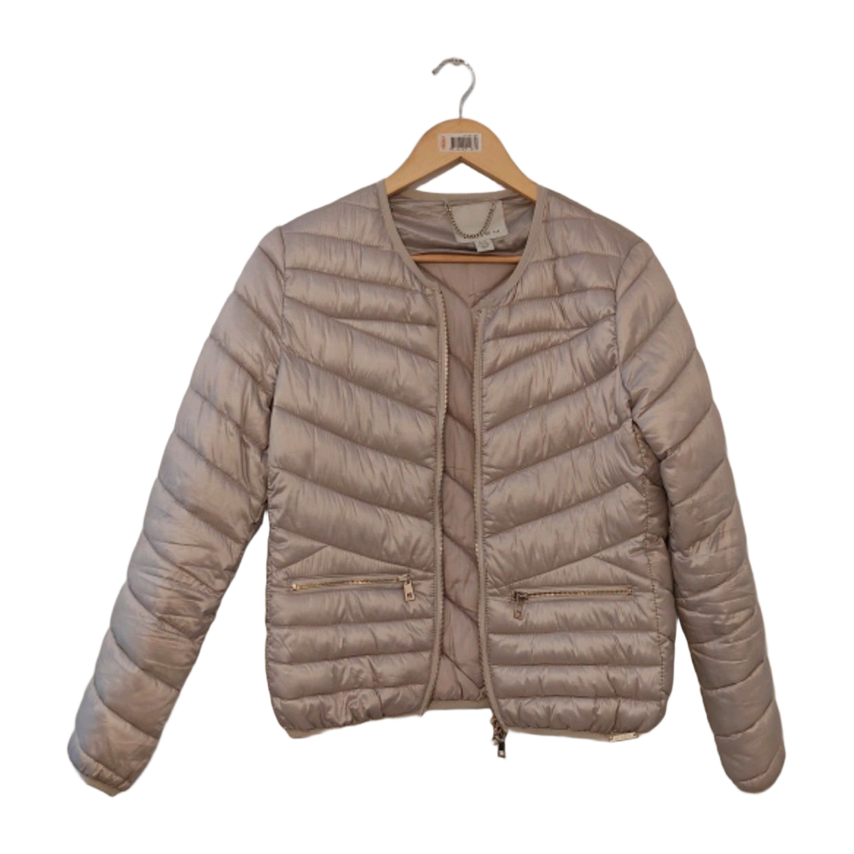 Kultainen kevyttoppatakki. Vetoketjulliset taskut.