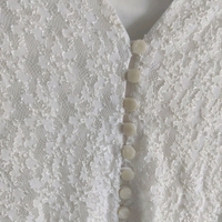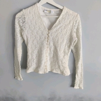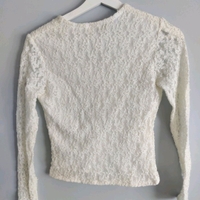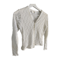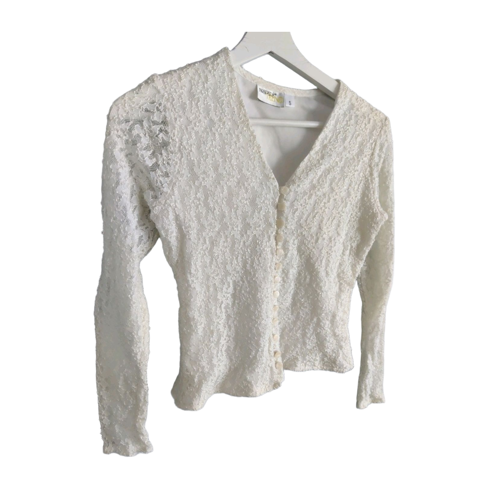 Luonnonvalkoinen pitsinen paita 90- luvulta. Kunto oikein hyvä. Muuten vuoritettu, hihat läpinäkyvät. Edessä pienet napit. Koko S, kai-kai 42 cm, pituus niskasta helmaan n. 46 cm. Kangas ei juurikaan jousta. #lace #90s #y2k