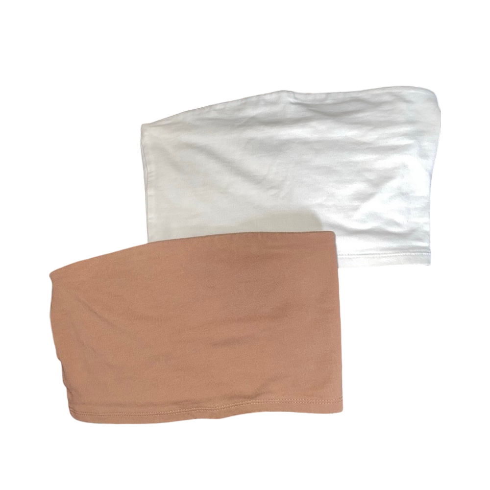 Kaksi ihanaa tube toppia. Yksi valkoinen ja toinen beige/vaaleanruskea. Hyvässä kunnossa molemmat ja vähän käytettyjä. Koko XS.