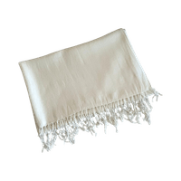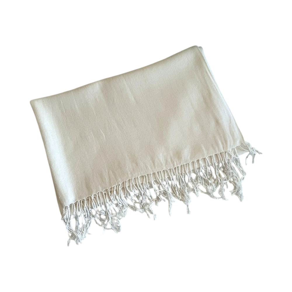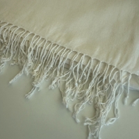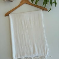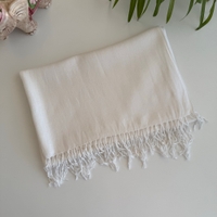 Valkoinen kevyt huivi, jossa hapsut. Pituus 178 cm ja leveys 70 cm.