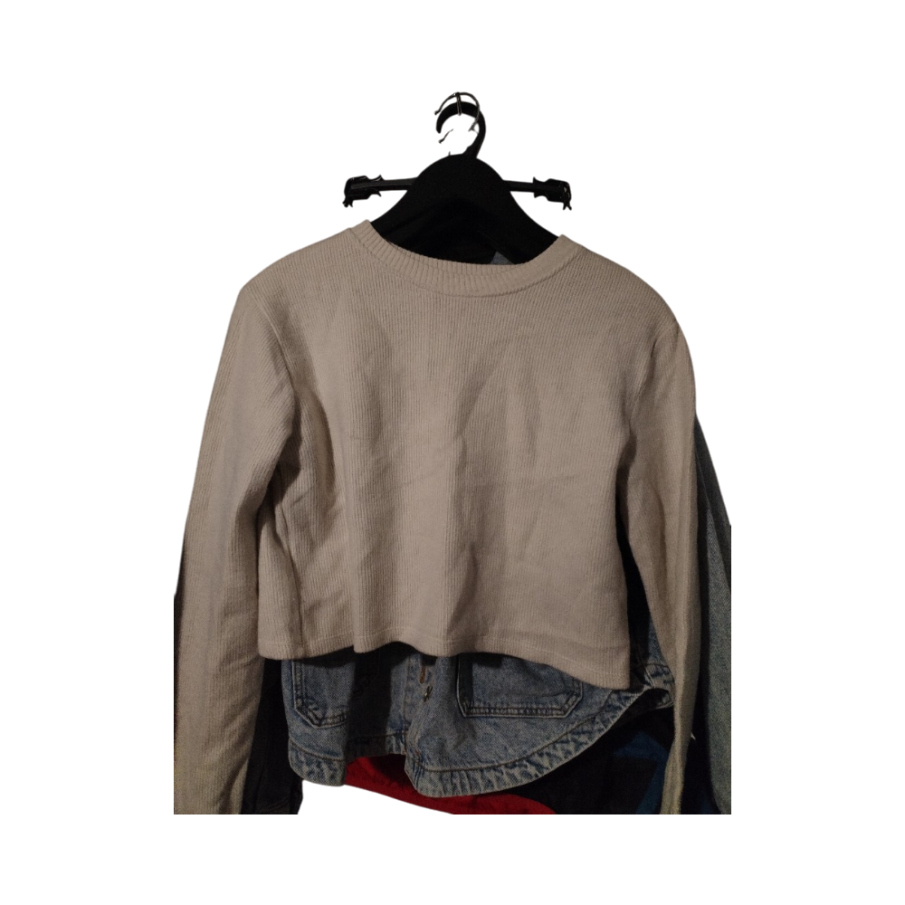 Lyhyt ribbineulottu pusero, pitkähihaiset ja pyöreä pääntie.