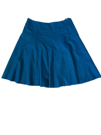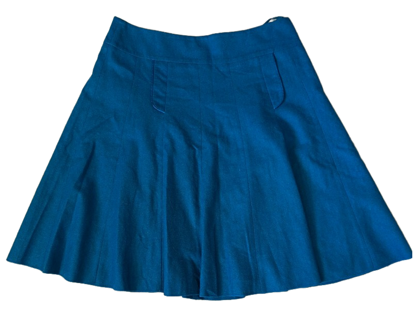 Sininen hame, 70% villa, 30% polyesteri, vuori 100% asetaatti. Vyötärönympärys 90cm ja 60cm pitkä