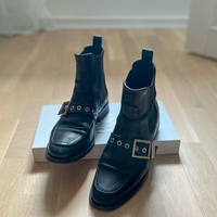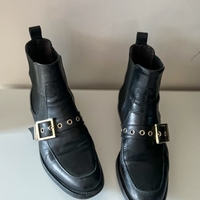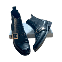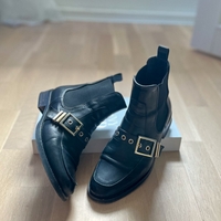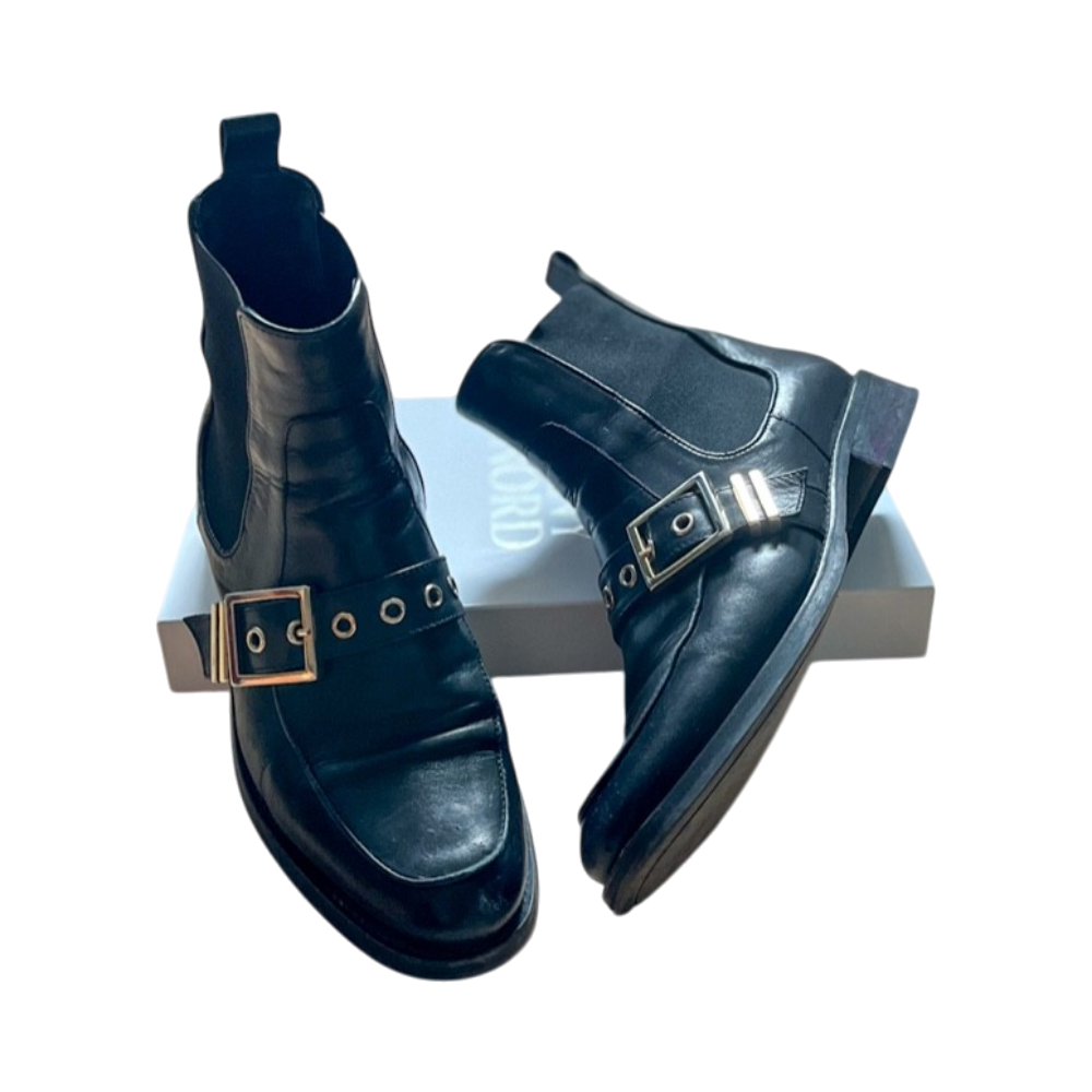 Musta nahkainen chelsea-nilkkuri, koristelukolla ja rei'ityksillä.