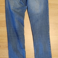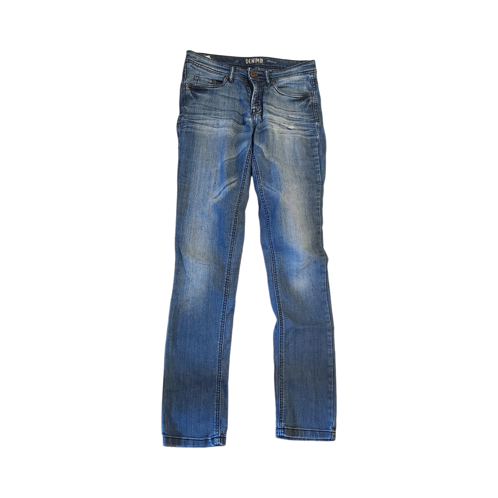 Siniset strech -farkut, kulutettua wash-viimeistelyä.