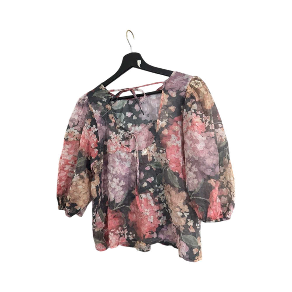 Käyttämätön kevyttä materiaalia oleva kukkapusero, narut edessä.