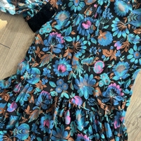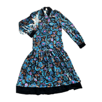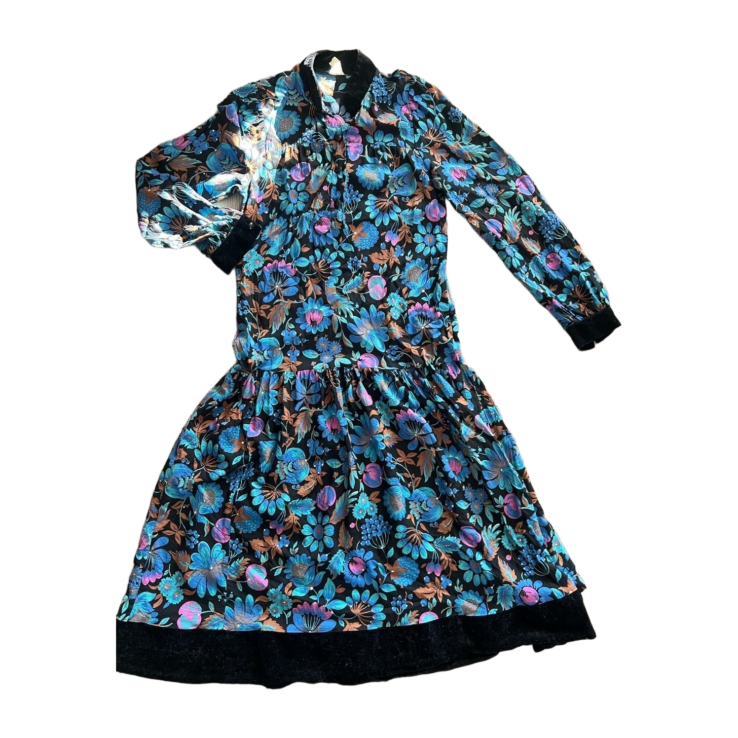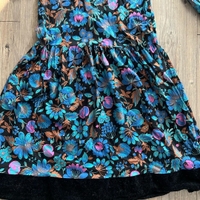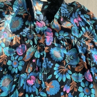 Kaunis Vintage kukkamekko, samettiset yksityiskohdat kauluksessa, hihansuissa ja kauluksessa. Pituus 109cm ja kai kai mitta 44cm. Vastaa arviolta kokoa s. Oikein siistissä kunnossa