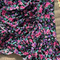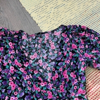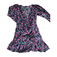 Kaunis kukkakuvioinen minimekko, kietaisutyylinen leikkaus ja kivat röyhelöt. Pituus 83cm ja kai kai mitta 45cm, vastaa arviolta kokoa s.