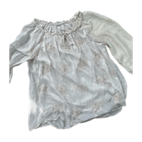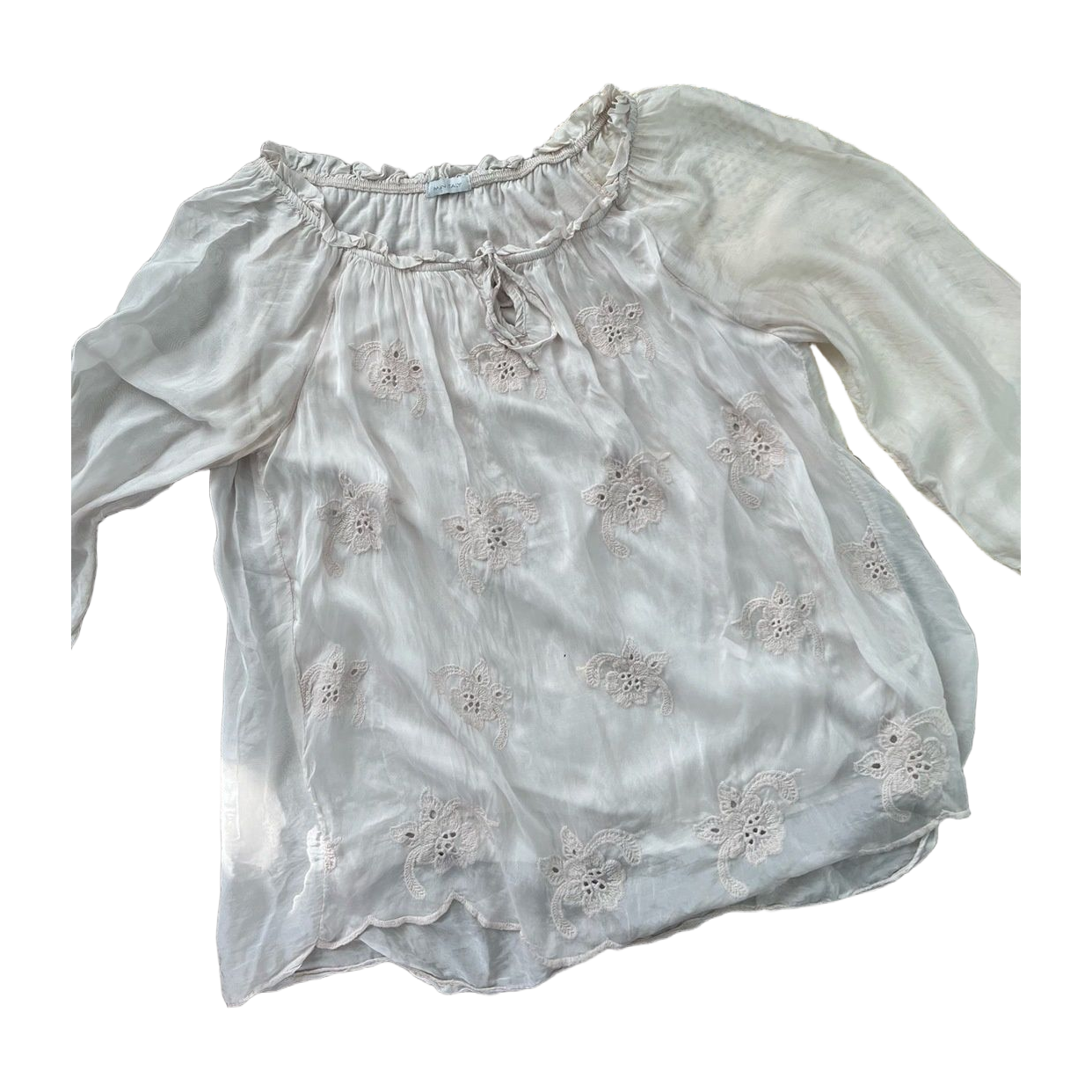 Kaunis koristeellinen silkkipaita, joustava vuorikangas. Pituus 69cm ja kai kai mitta 55cm. Siistissä kunnossa.
