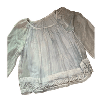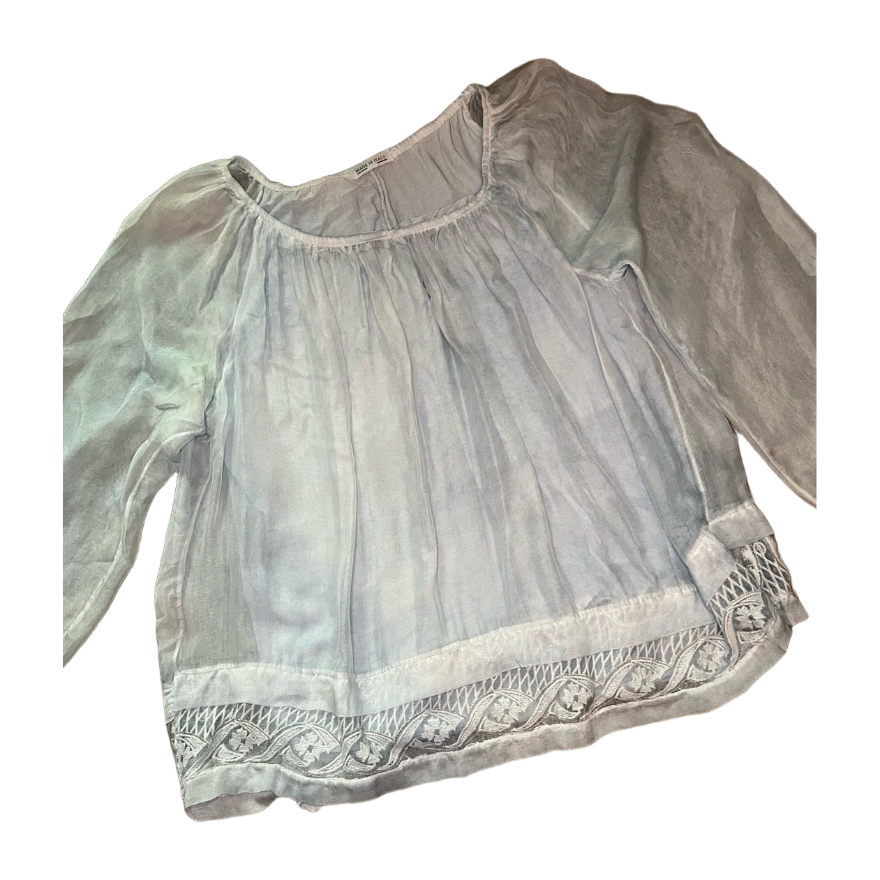 Kaunis vaaleansininen silkkipaita. Pituus 69cm ja kai kai mitta 50cm. Vastaa arviolta kokoa m. Oikein siistissä kunnossa
