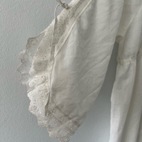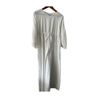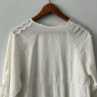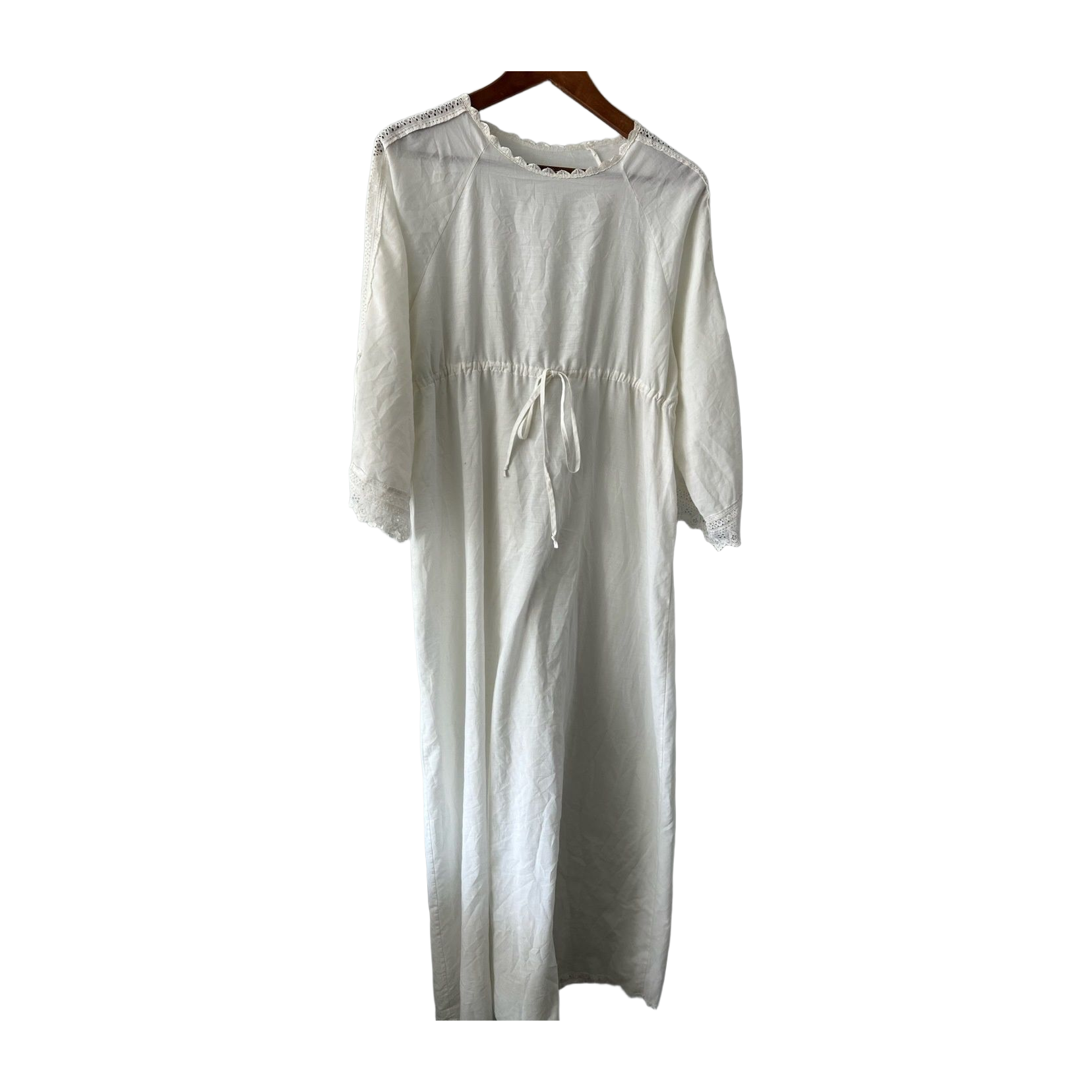 Kaunis puuvillainen Vintage mekko, pitsikoristeet ja vyötäröllä nyöri. Pituus 141cm ja kai kai mitta 49cm, vastaa arviolta kokoa s