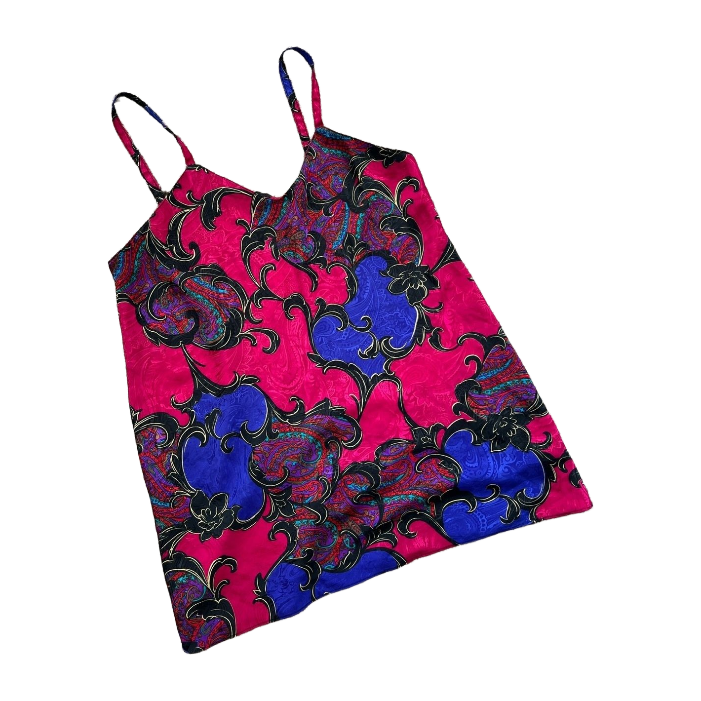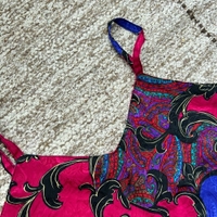 Kanadassa valmistettu satiininen toppi, pituuden puolesta menee myös minimekkona. Kokomerkintä xxl, mutta vastaa enemmän kokoa m/l. Pituus 81cm ja kai kai mitta 52cm. Todella siistissä kunnossa