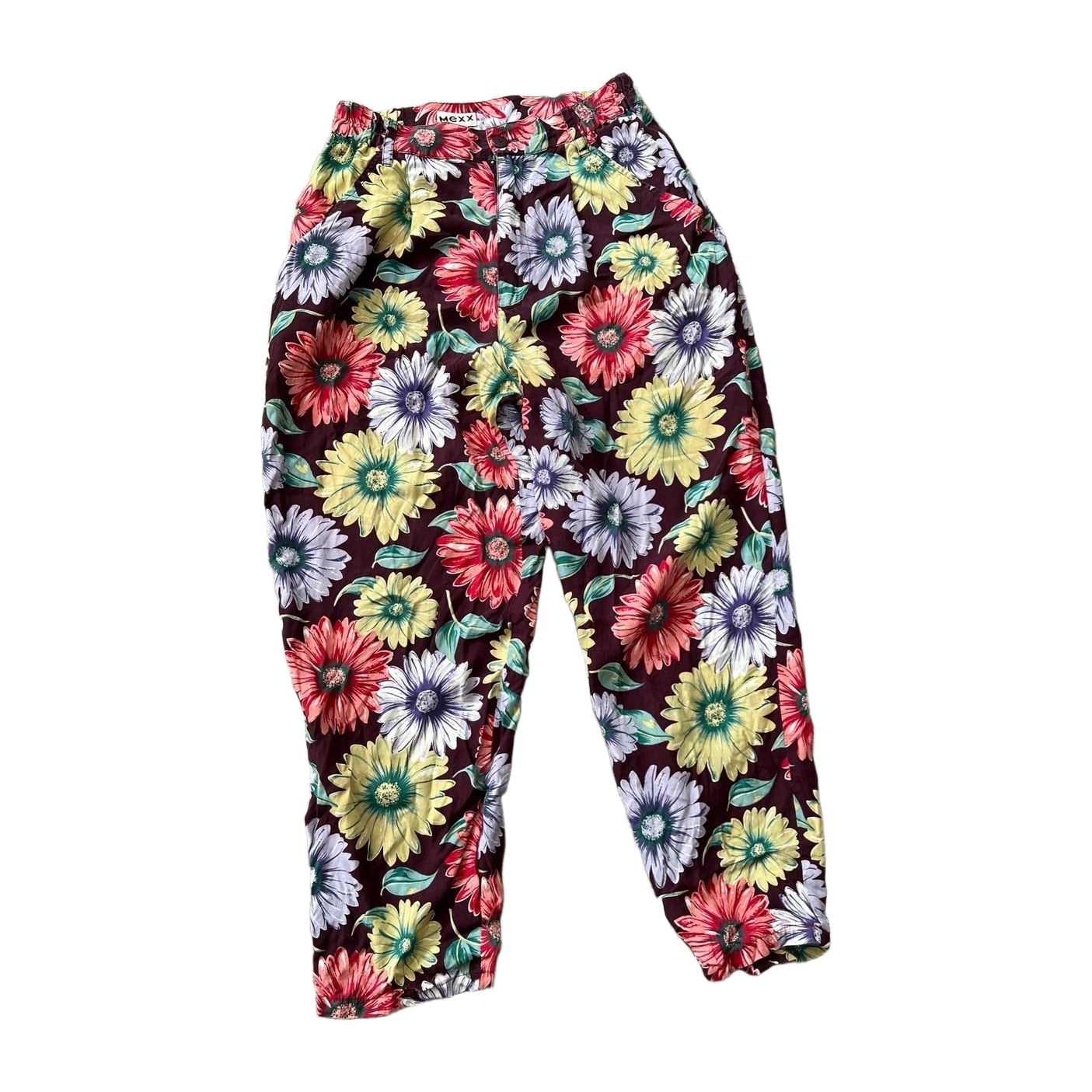 Mexx Vintage kukkahousut, väljä istuvuus. Koko 38, lahkeen sisämitta 65cm ja vyötärönympärys venyttämättä 64cm.