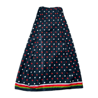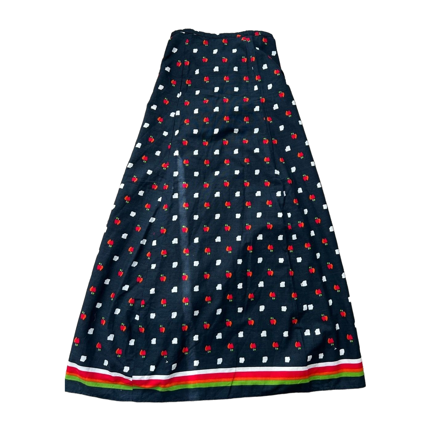 Upea maximittainen Vintage hame, vuoritettu. Pituus 109cm ja vyötärönympärys 68cm. Hyvässä kunnossa, mutta kuvista näkee yhden kohdan jäljen, ei huomattava käytössä.