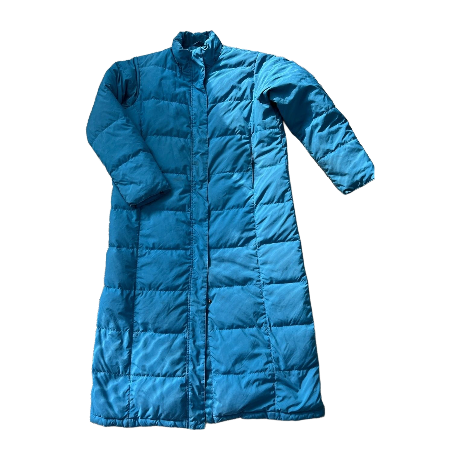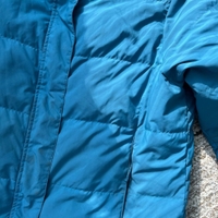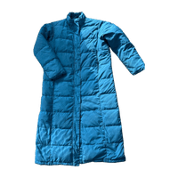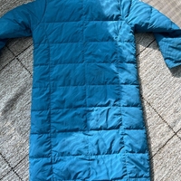 Todella lämmin ja muhkea untuvatakki, koko l. Pituus 125cm ja kai kai mitta 61cm. Yleisilme hyvä, pientä tahraa, ei huomattavaa.
