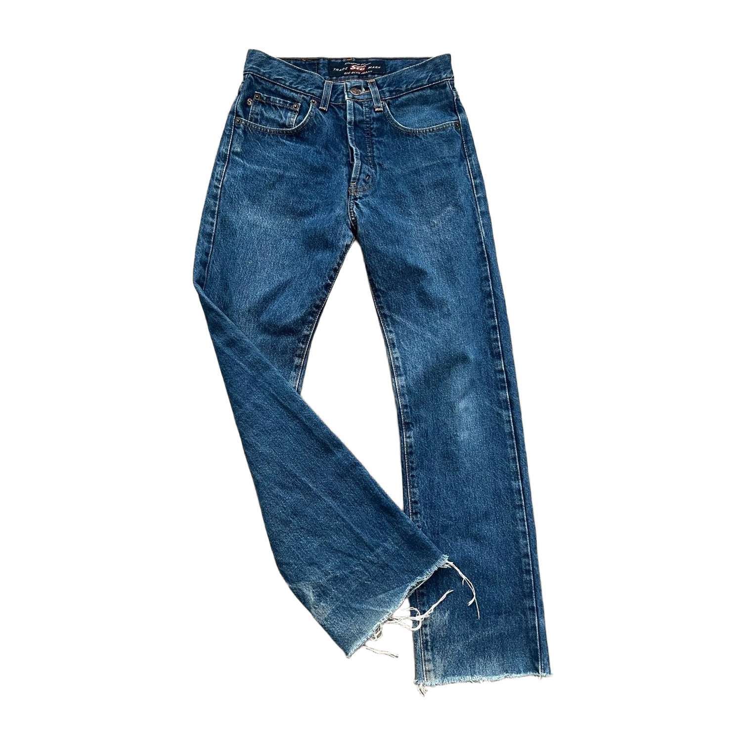 Italiassa valmistetut Vintage farkut, koko 26”. Lahkeen sisämitta 70cm ja vyötärönympärys 68cm. Tukevaa farkkua, korkeavyötäröiset