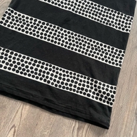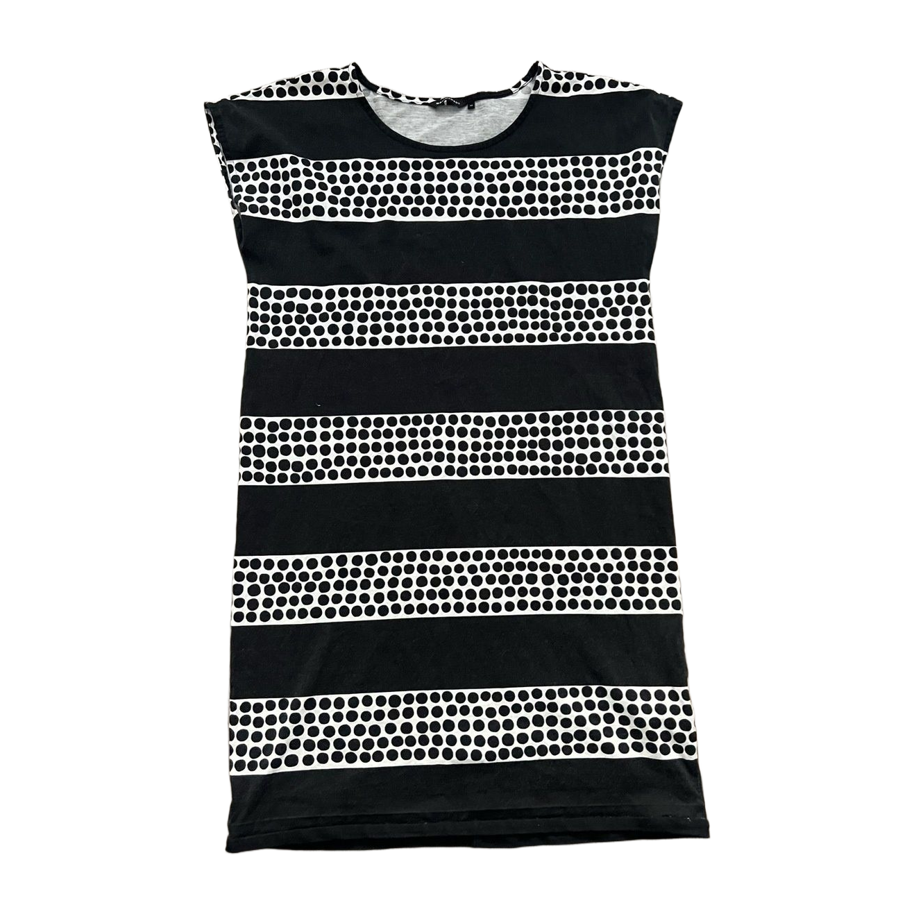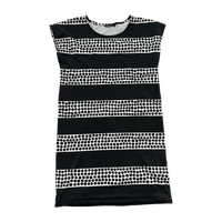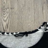 Marimekon joustava lyhyt mekko, koko xs. Yleisilme hyvä, mutta helman sauma jouduttu korjaamaan kun purkautui hieman, ei huomattavaa käytössä. Pituus 84cm ja kai kai mitta venyttämättä 45cm.