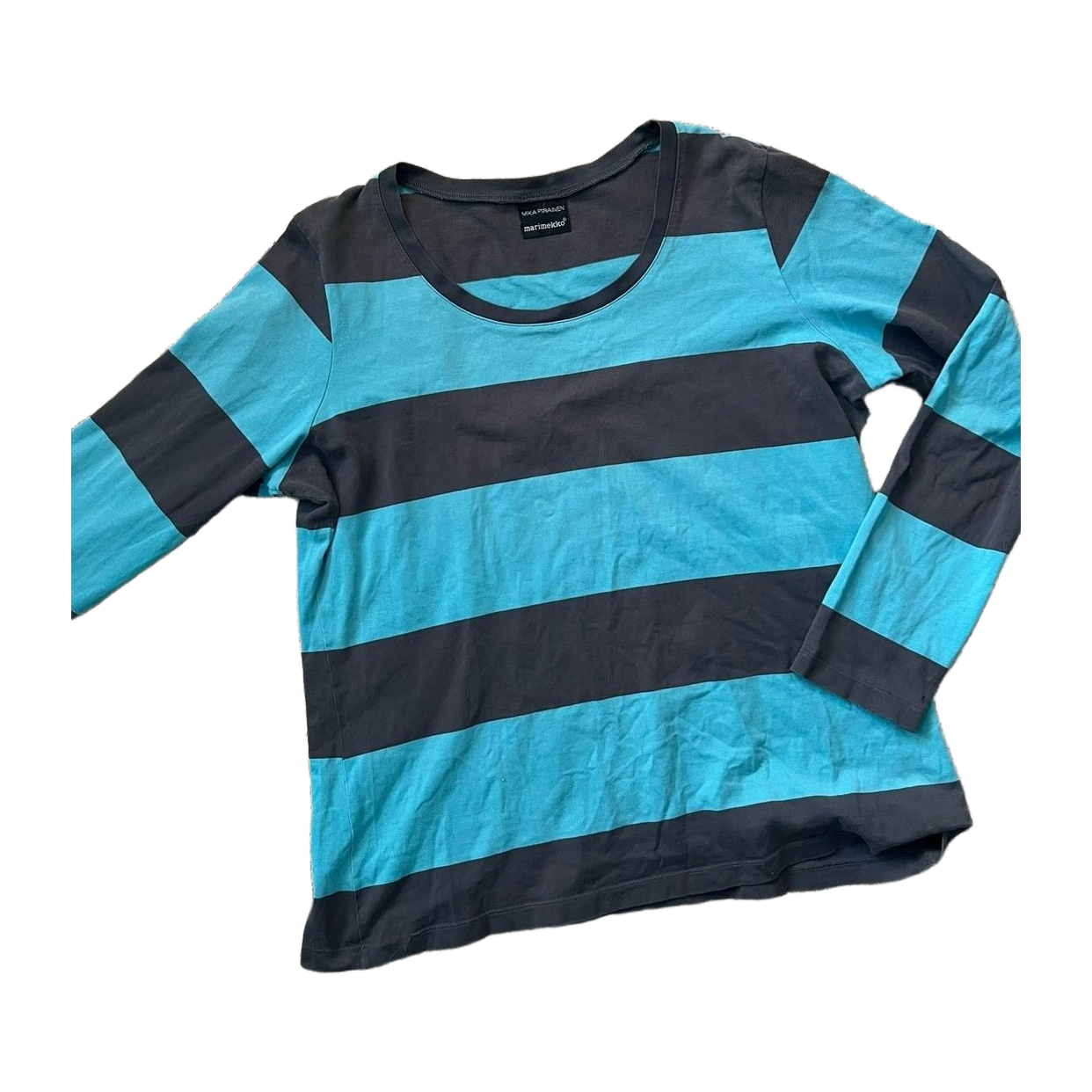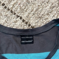 Marimekon vanha raidallinen paita, yleisilme ok mutta kulumaa löytyy. Pituus 68cm ja kai kai mitta 51cm