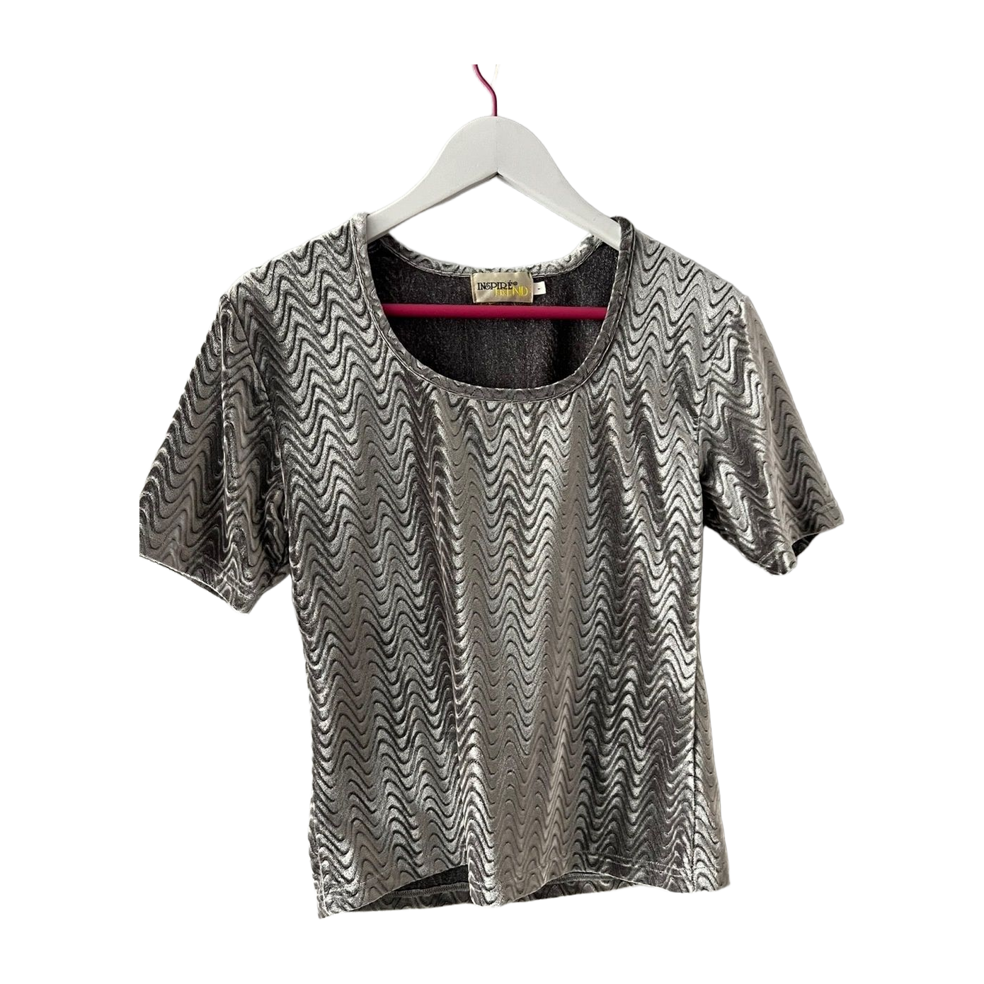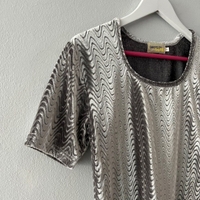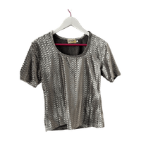 Hopeanvärinen joustava samettipaita, todella siistissä kunnossa. Koko l, pituus 57cm ja kai kai mitta venyttämättä 44cm.