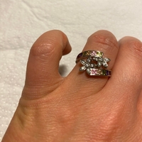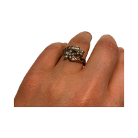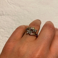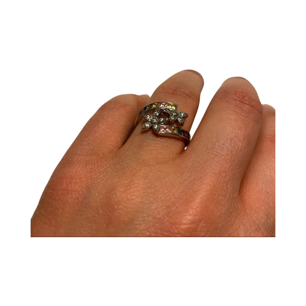 Sävykkäillä kivillä koristeltu hopeanvärinen kukkarengas.