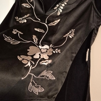 Musta lyhythihainen pusero hopeakirjailulla. Japanilaistyyppinen leikkaus v-kauluksella. Paksu pehmeä läpinäkymätön materiaali. Olen pesulapun leikannut pois.