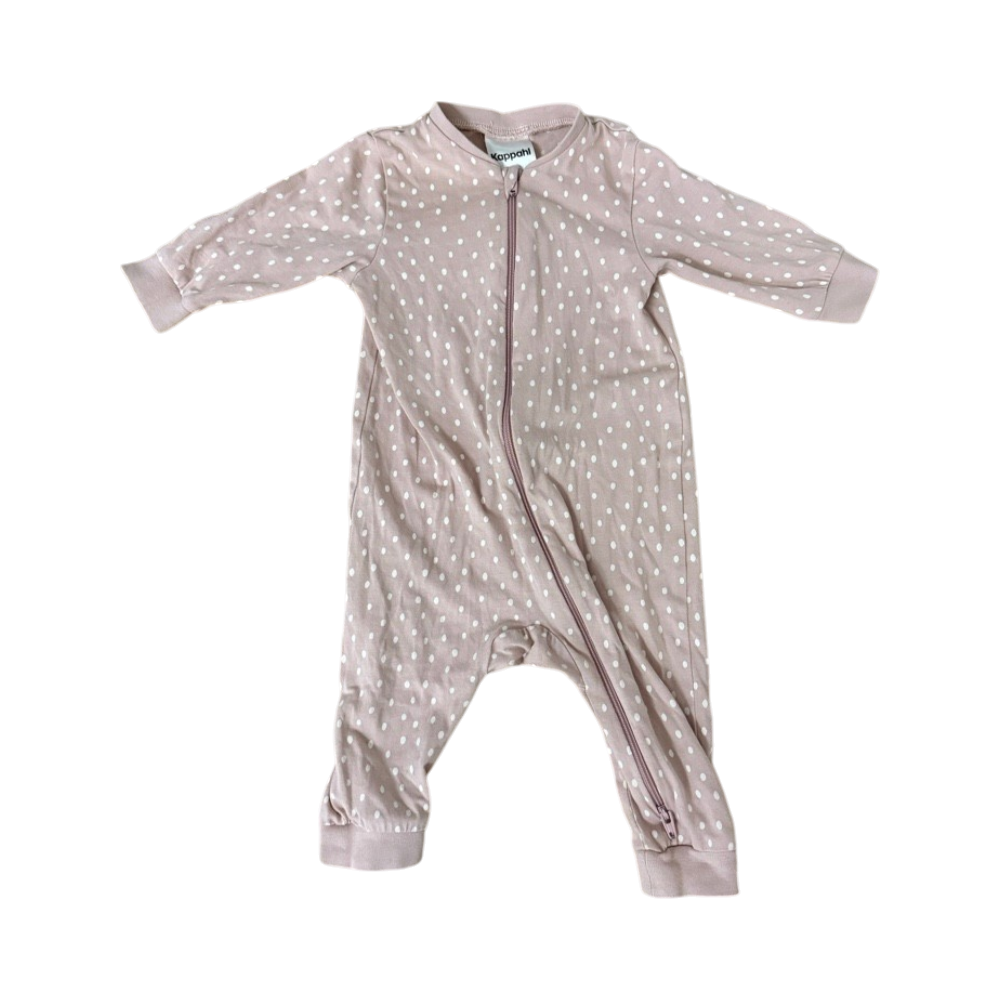 Vaaleanpunainen pilkullinen vauvan pyjama, vetoketjulla.