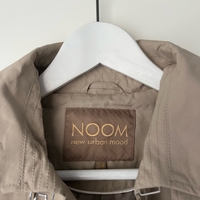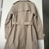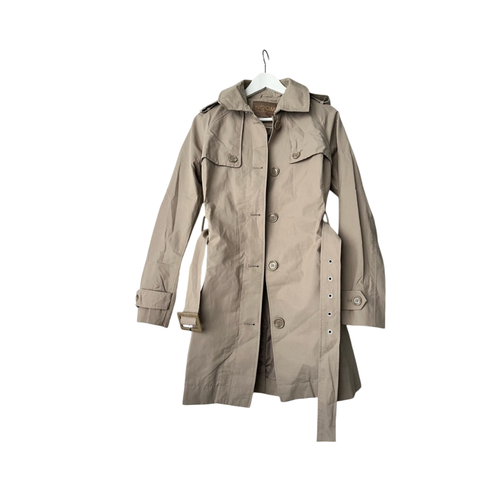 Beige trench jacket.