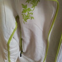 Valkoinen huppari vihreillä yksityiskohdilla ja vetoketjuilla. Kauluksessa vähän kulumaa.