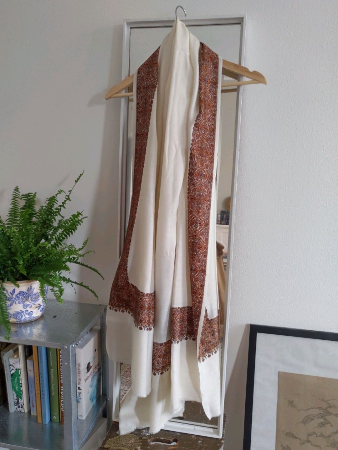 Brand new Pashmina Kashmiri embroidered shawl. Lovely fall colored embroidery running along the border. Perfect as a gift.